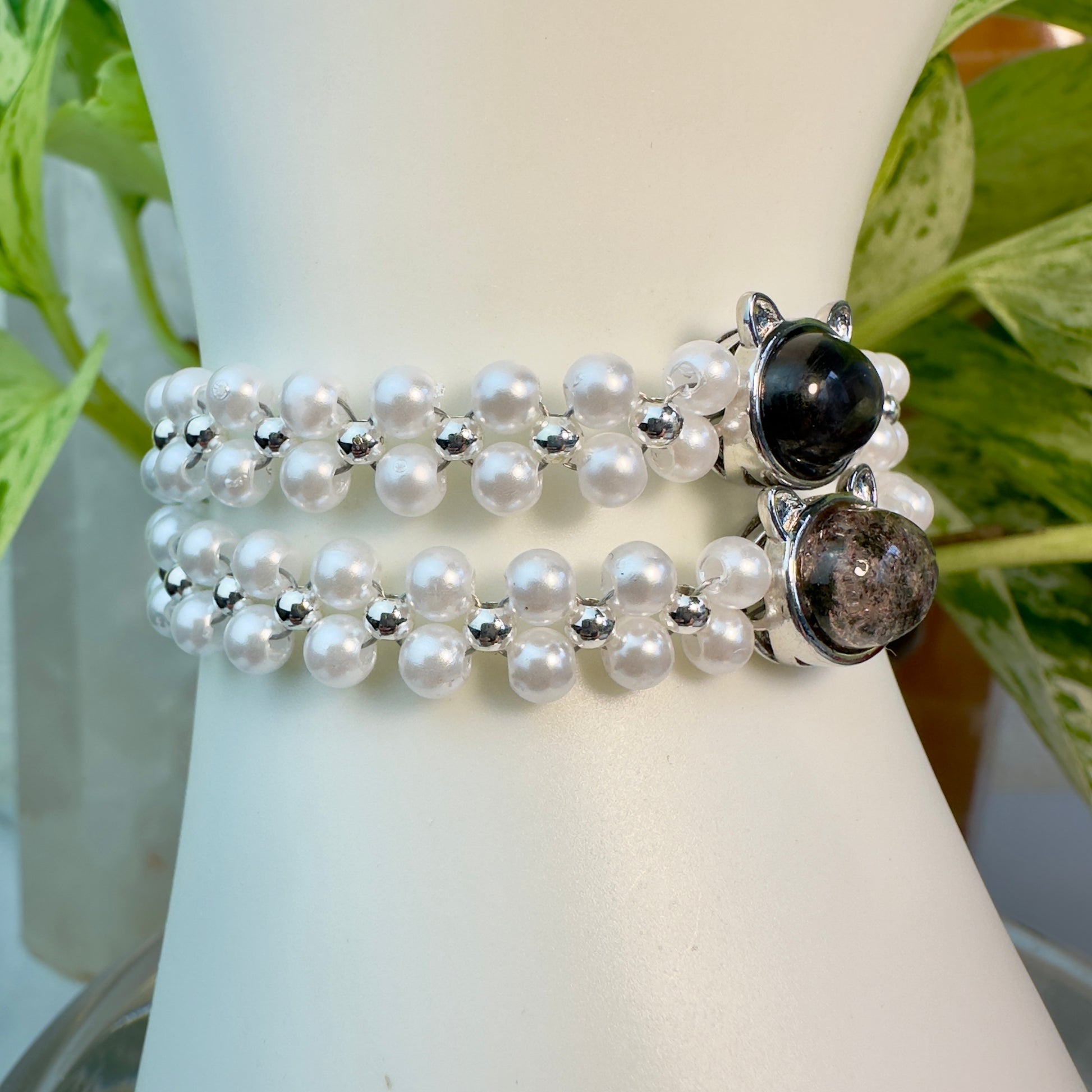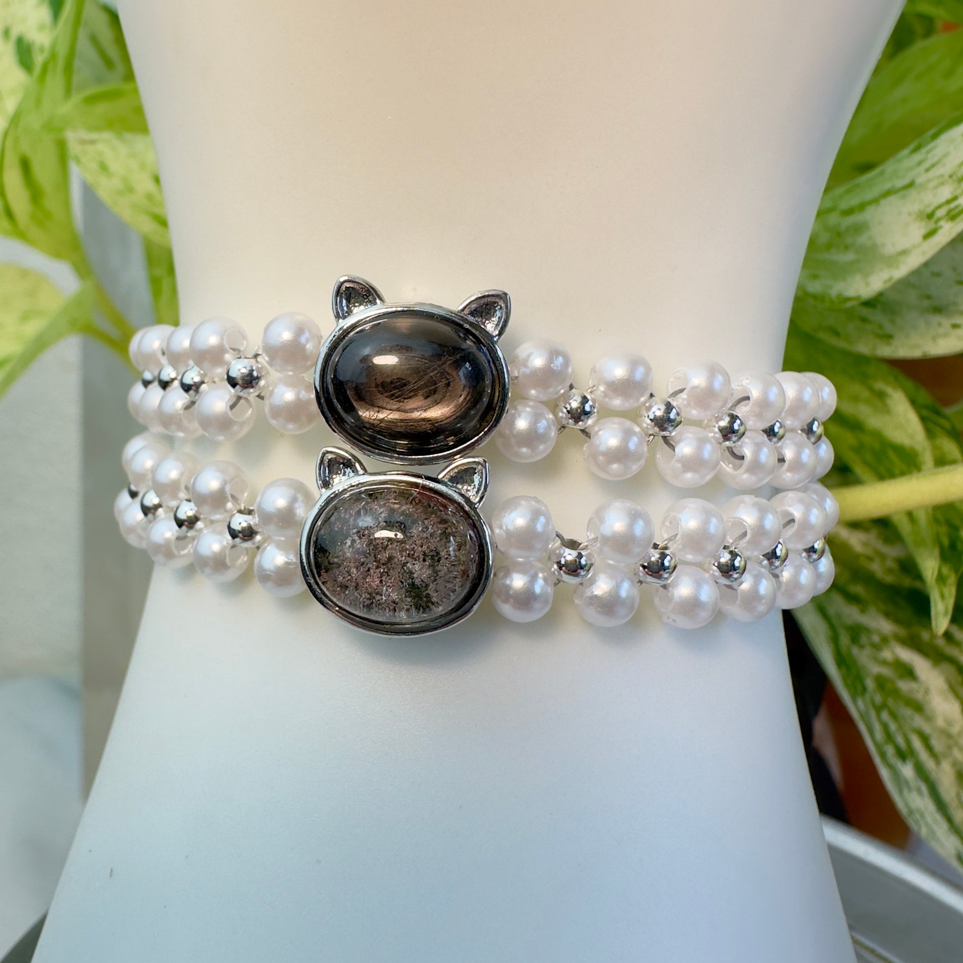 These charming cat bracelets pair faux pearl double strands with your choice of natural Garden Quartz or shimmering Hypersthene as the focal stone. The cat-ear setting adds a playful, mystical touch.