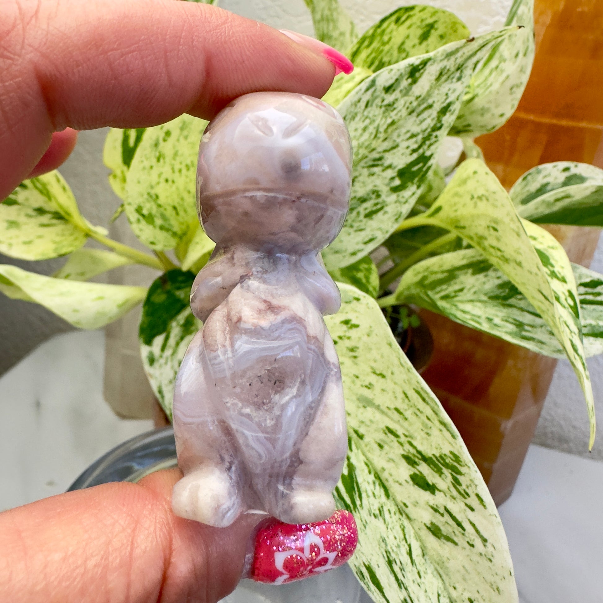 Graceful and full of charm, this flower agate dino stands 2 inches tall and brings soft, blooming energy to any space. Each piece showcases dreamy pink hues with delicate white plume patterns that resemble tiny blossoms frozen in stone.