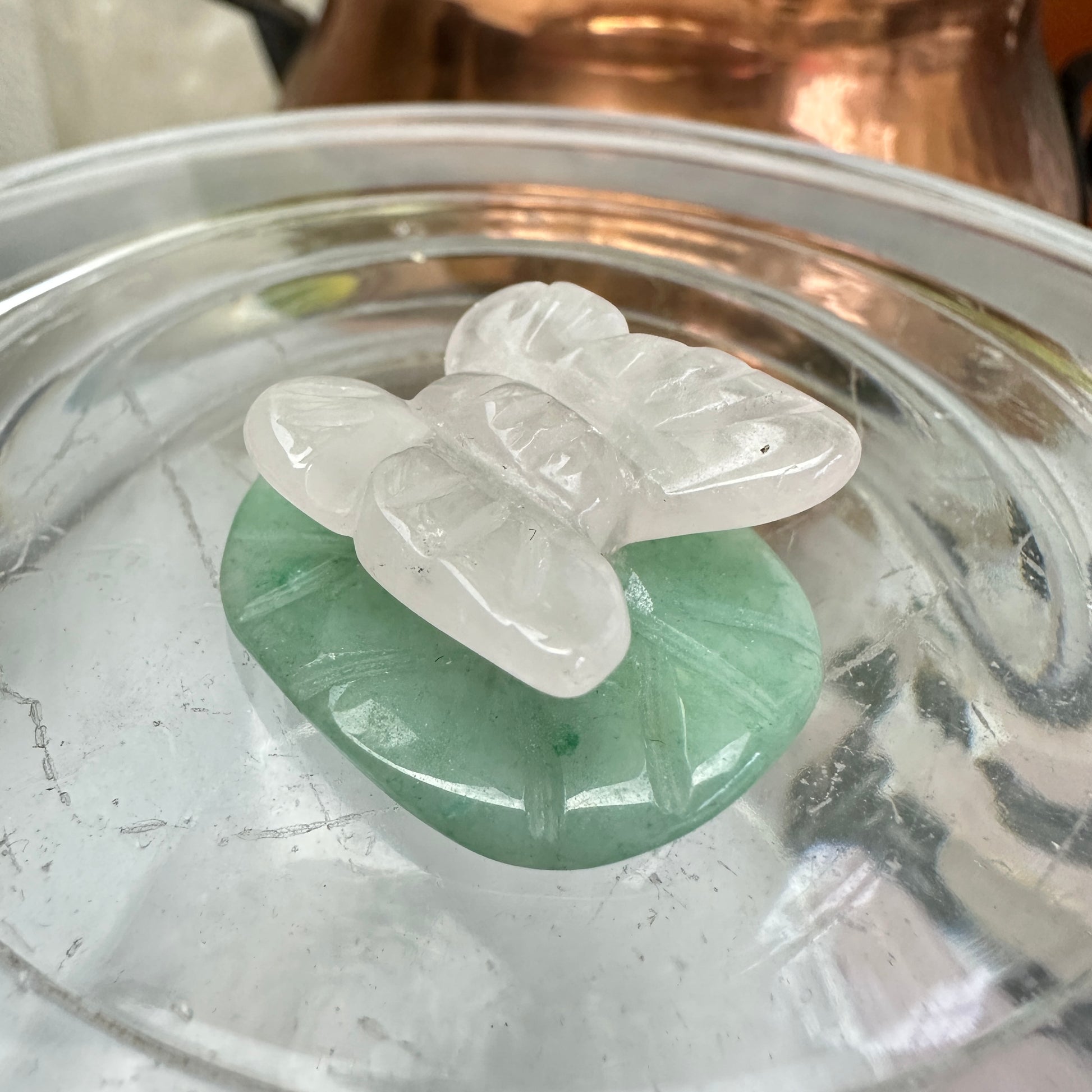 These miniature crystal creatures, perched atop hand-carved green aventurine lilypads and leaves, bring a touch of whimsy and woodland magic to any crystal collection. Each piece features a unique creature—frog, snail, butterfly, dragonfly, toad, or caterpillar—carved from a variety of natural stones. With soft earthy tones and playful energy, these pieces are full of personality and grounding charm. Crystal types and creatures are selected intuitively, and not all combinations are available.