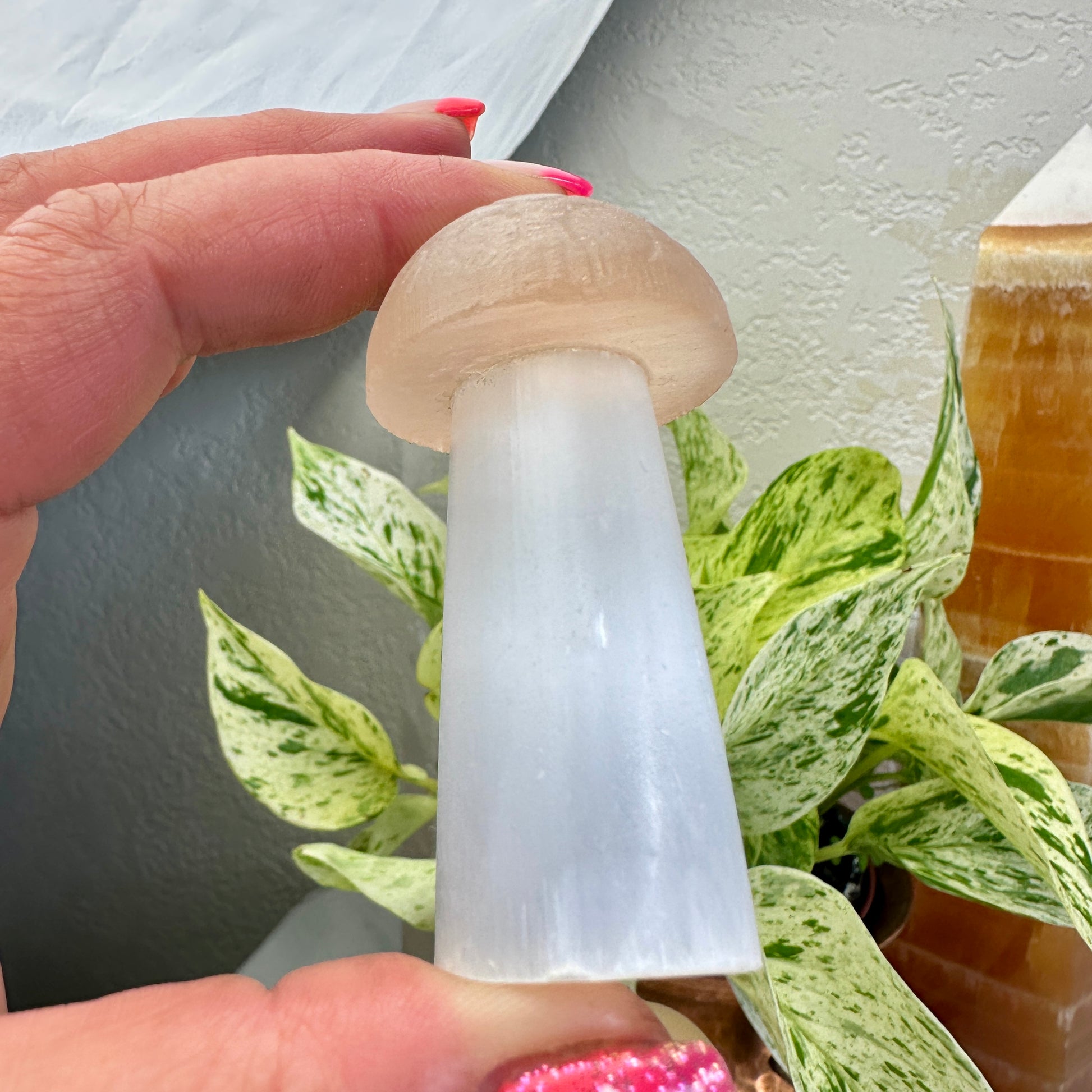 These enchanting crystal mushrooms stand about 3.8 inches tall and are carved from luminous satin spar. With a glowing white stem and a soft peach cap, each one radiates serene energy and natural beauty — perfect for grounding your space in light and calm.