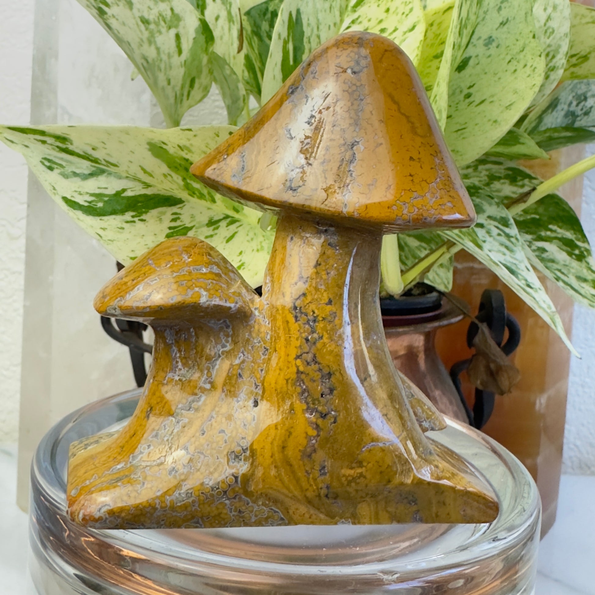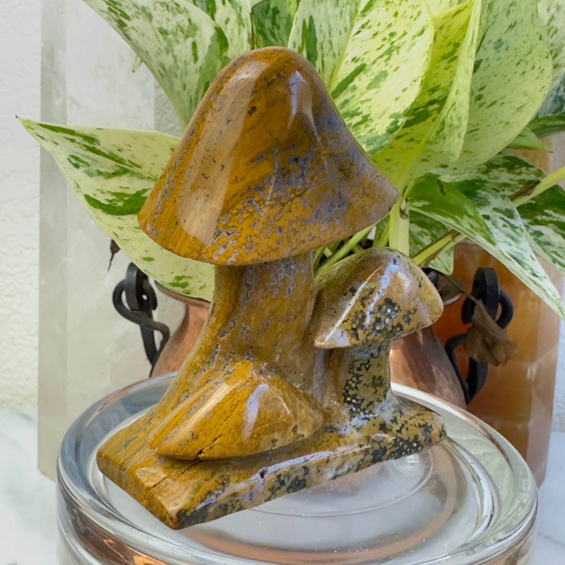 Hand-carved from natural yellow spotted jasper, this group of three mushrooms is a cheerful, earthy symbol of grounding and harmony. With warm golden hues and organic speckled patterns, the trio grows together from a shared base—representing unity, resilience, and connection to nature. Whether used decoratively or spiritually, this 4-inch-tall carving makes a whimsical and meaningful addition to any crystal garden or altar.