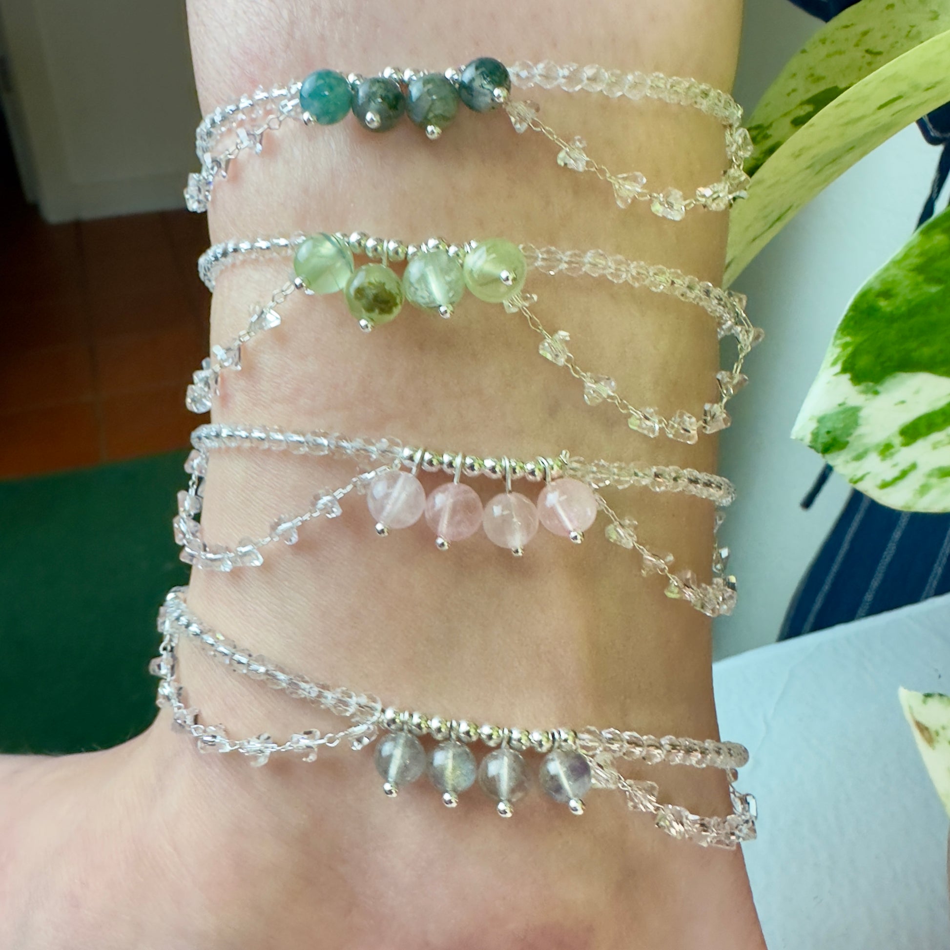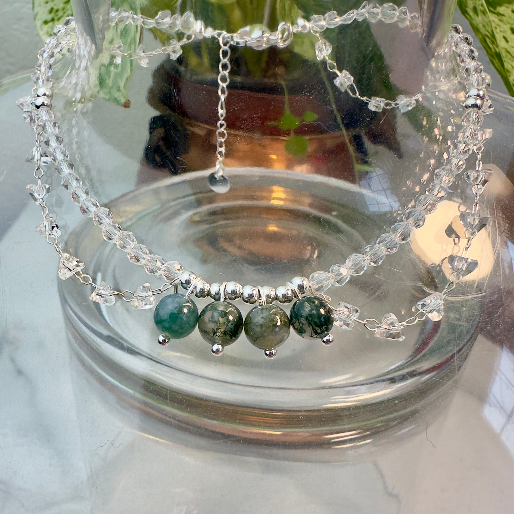 Handmade with care and cottagecore magic, these whimsical anklets feature sparkling glass beads strung like dewdrops on a silver thread. Each anklet is adorned with four crystal dangles, gently swaying like charms of intention. Choose your favorite gem and let it guide your energy: